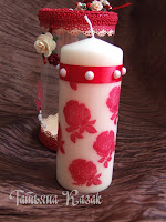 Наконец то я смогла сфотографировать свою свечку. Свеча украшена лентой с полубусинами и штампами. Это первый мой опыт со свечкой - было очень интересно попробовать, что из этого получется. Метод украшения прост - на тонкую бумагу тишью я нанесла рисунок штампом розы, бесцветными чернилами VersaMark. Затем всю эту красоту посыпала пудрой для эмбоссинга и расплавила её при помощи горячего пистолета. Ну и потом приложила эту украшенную бумагу к свечки и аккуратно нагревала свечу всё тем же горячим пистолетом. Тут всё надо делать давольно быстро и смотреть чтоб не появились подтёки воска.